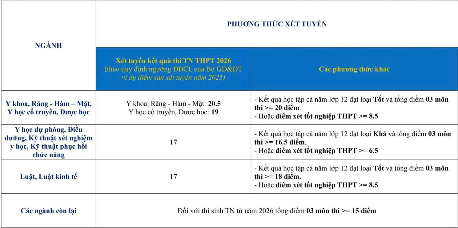 – Phương thức 1: Xét tuyển kết quả thi tốt nghiệp THPT 2026 theo tổ hợp môn.